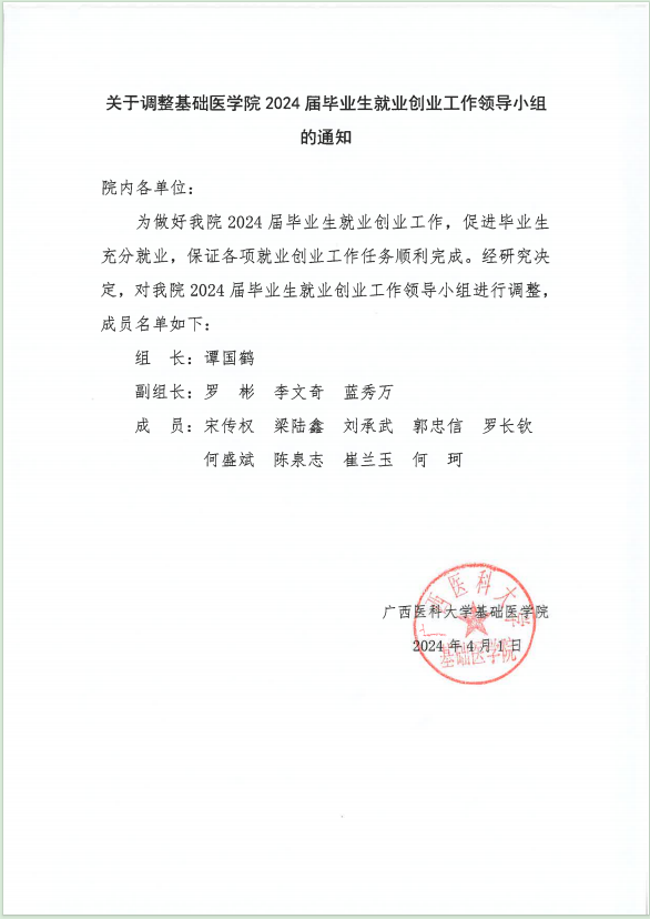 关于调整2024届毕业生就业创业工作领导小组的通知