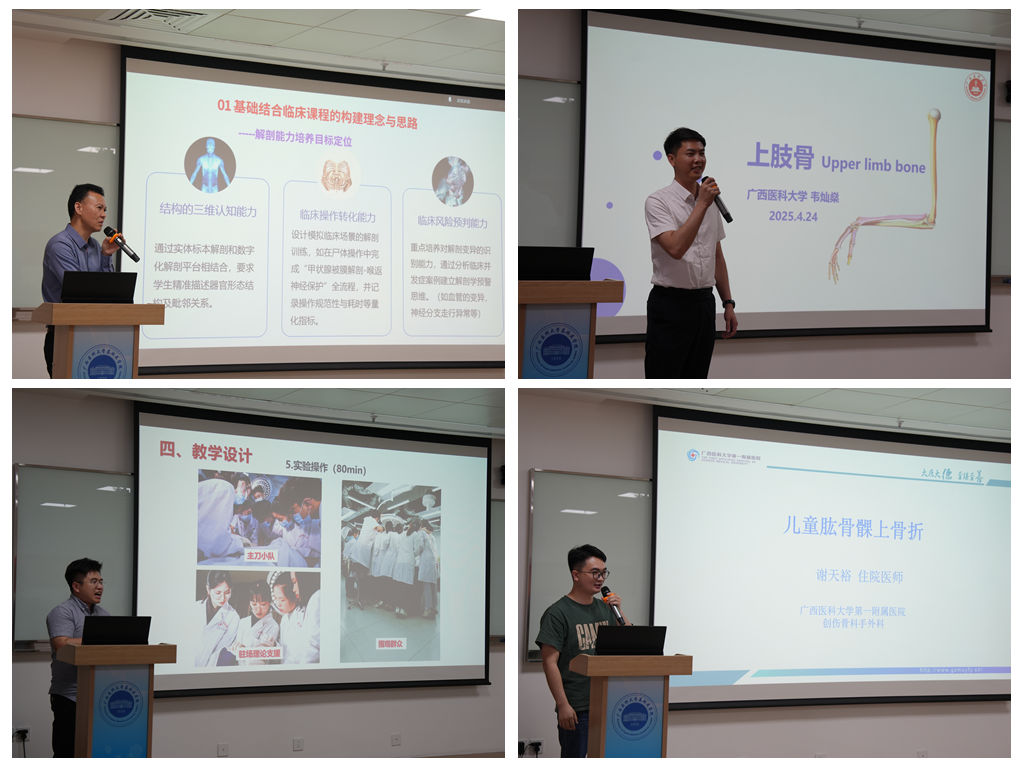 在分享环节,《局部解剖学》自治区一流本科课程负责人邓祥发教授提出“临床反哺教学”理念,倡导依临床需求优化解剖学教学设计;韦灿燊老师展示《上肢骨》虚实结合的教学设计,借助数字人提升课堂互动效果;林圣钧老师以《臂部、肘部和前臂》为例,精准剖析解剖细节与临床应用;公司第一附属医院谢天裕老师从临床视角解析《儿童肱骨髁上骨折》案例,串联解剖与临床的决策思维。
