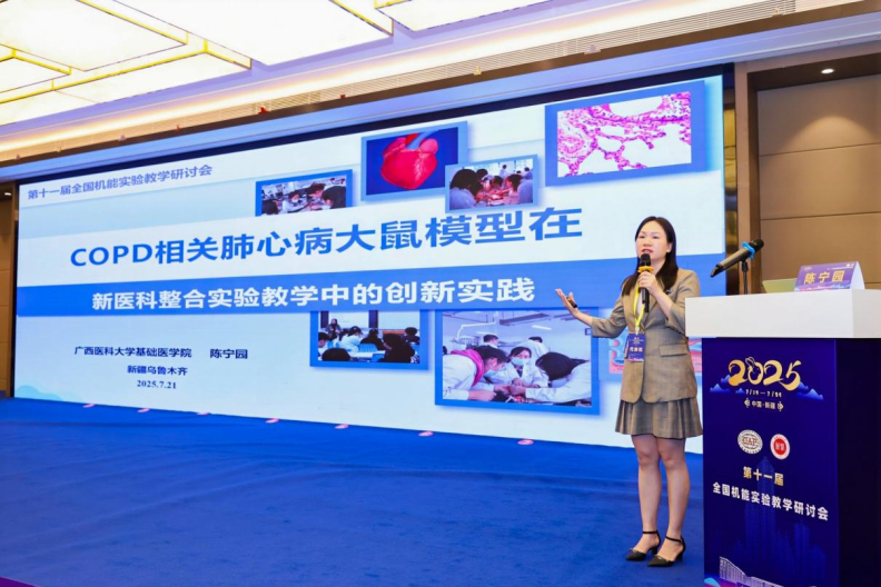 大会报告环节,陈宁园作题为《“临床-基础”双轨驱动:COPD相关肺心病大鼠模型在新医科整合实验教学中的创新实践》的主题报告。她提出的“临床-基础”双轨驱动模式,通过COPD大鼠模型将真实病例融入实验教学环节,有效提升员工科研与临床融合的能力。这一创新举措引发与会专家热烈讨论,并获得高度评价。