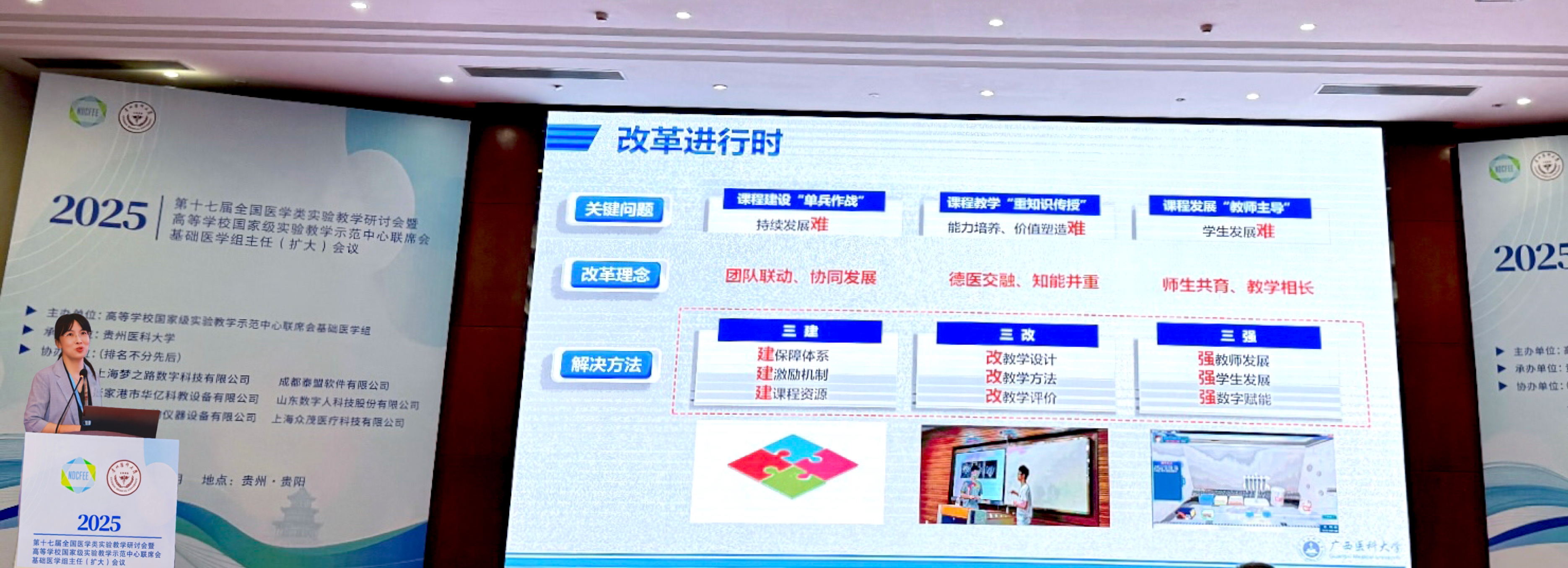 会议期间,罗彬受邀作《强基铸魂,数字赋能-新医科背景下基础医学金课建设的守正与创新》专题报告,系统阐述了公司基于OBE理念在“金课”建设方面的创新举措与显著成效,并重点分享了AI赋能课程改革中的实践经验,引发了与会专家的高度关注和一致好评。在同期举办的第十七届高等公司医药类课程一流课堂设计展示大赛中,公司教师表现优异,细胞生物学与遗传学教研室李小翠老师荣获二等奖,病理生理学教研室邓冯媛老师荣获三等奖。