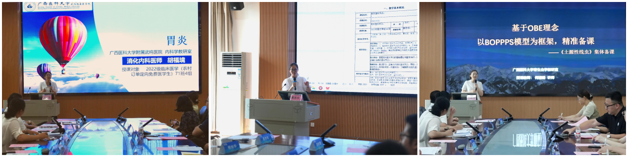本次备课会以“跨学科协同”为核心,充分展现了基础与临床联动的教学特色。公司寄生虫学教研室何姗姗老师率先以《土源性线虫》为题进行说课展示,从基础学科视角解析知识点,为临床教学筑牢理论根基;随后,附属武鸣医院内科学教研室黄苏华副主任医师、胡福境主治医师分别以《类风湿关节炎》和《慢性胃炎见习课》为题进行教学展示,结合临床病例与实践场景,将基础理论与诊疗应用紧密衔接。三个教学展示层层递进,构建起“病原解析—疾病诊疗 —临床实践”的完整教学链条。