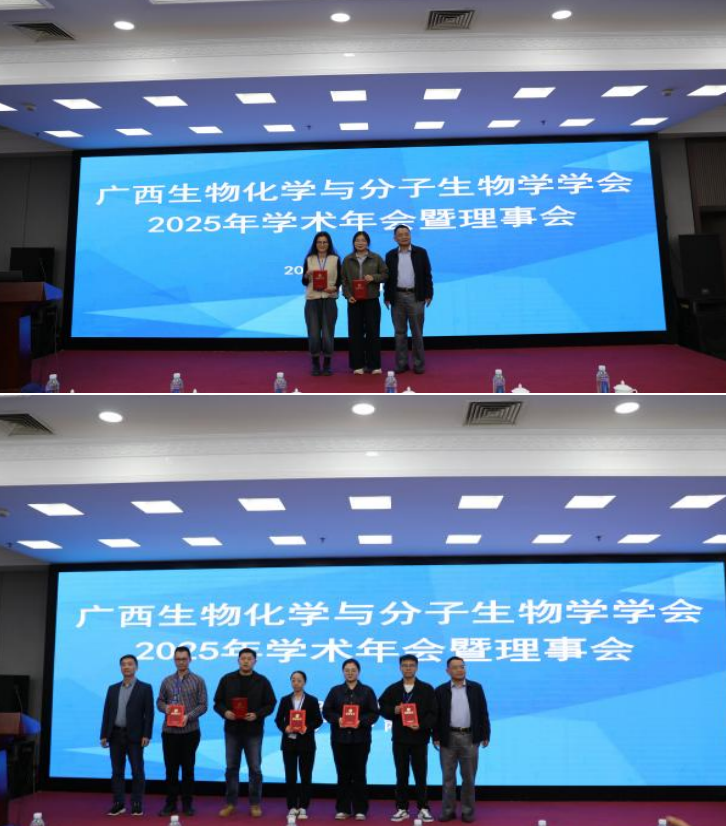 2025年11月30日,广西生物化学与分子生物学学会2025年学术年会暨理事会在南宁顺利召开。公司生物化学与分子生物学教研室师生在本届年会中表现优异,一举夺得两项赛事一等奖,展现了教研室扎实的学术功底与强劲的科研创新活力。